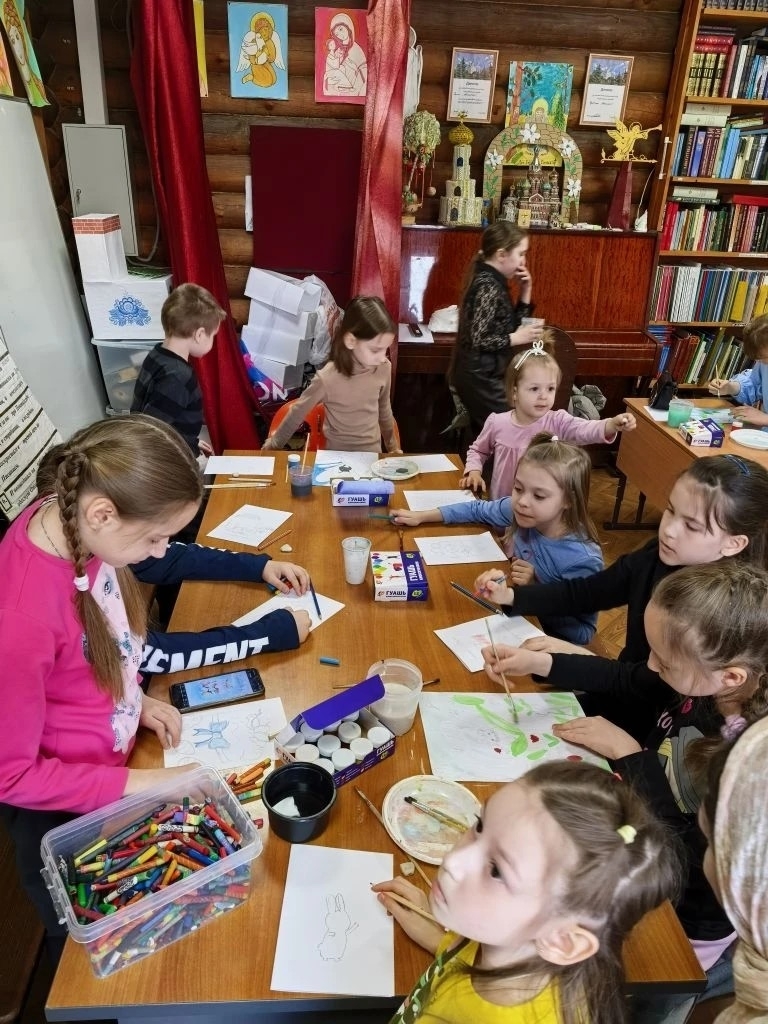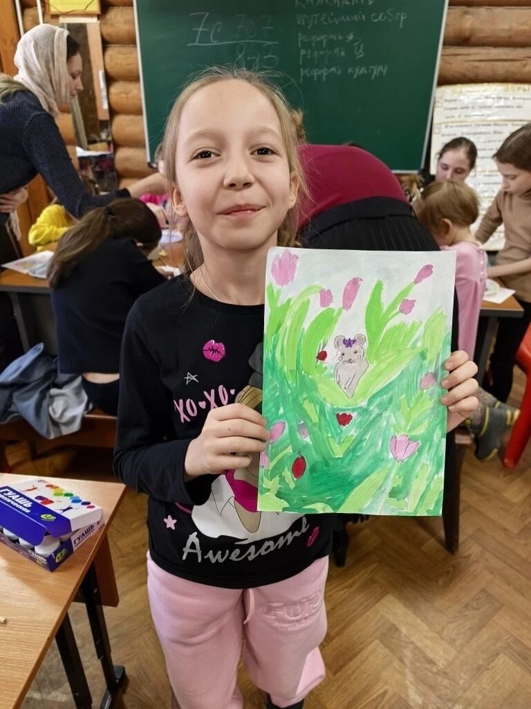 На уроке рисования дети доделали второй этап работы зверушек в цветах. А также под руководством Валерии Александровны ребята изготовили открытки к празднику Светлой Пасхи для бабушек и дедушек, которые живут в домах престарелых. Дети очень старались, и у них получились красивые подарки с тёплыми пожеланиями.